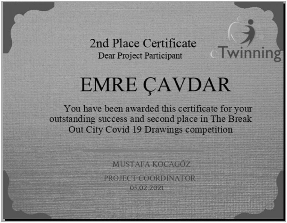 The Break Out City (Hayal Şehrim)eTwinning projesini yürüten İngilizce Öğretmeni Selen Ezer ve öğrencileri, 178 öğrencinin katıldığı 10 Türk 5 yabancı ortaklı projedeki Covid 19 kara kalem çalışmasında 2. Olmuşlardır. Öğrencimiz Emre Çavdar'ı tebrik ederiz.