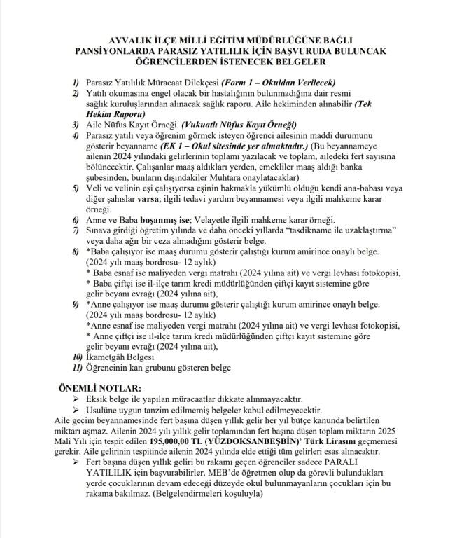 Pansiyon başvurusu için istenilecek belgeler ve bilgilendirme için tıklayınız.