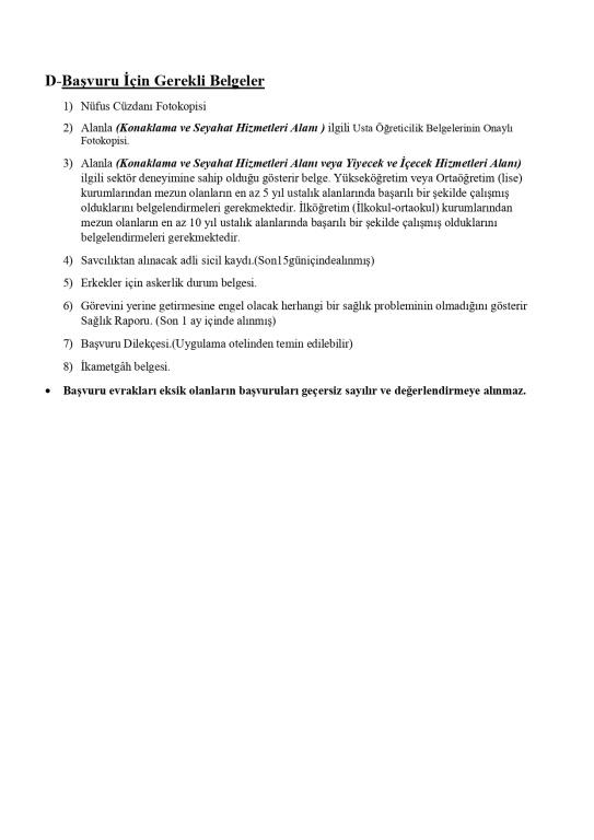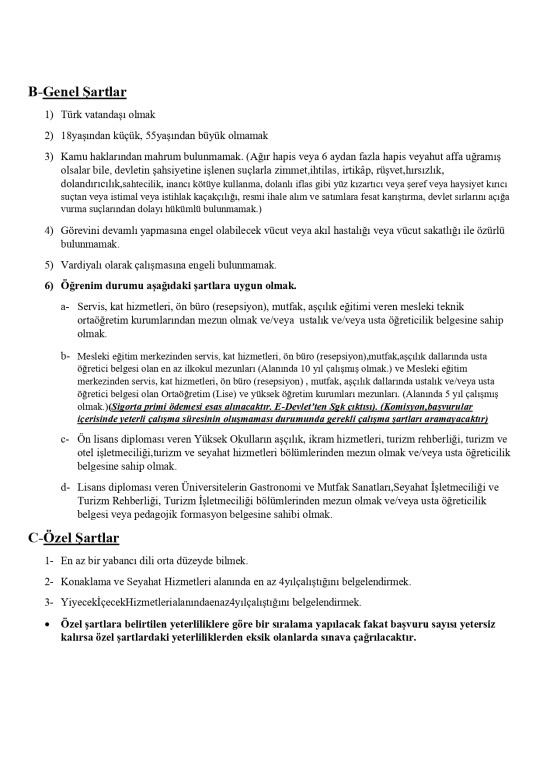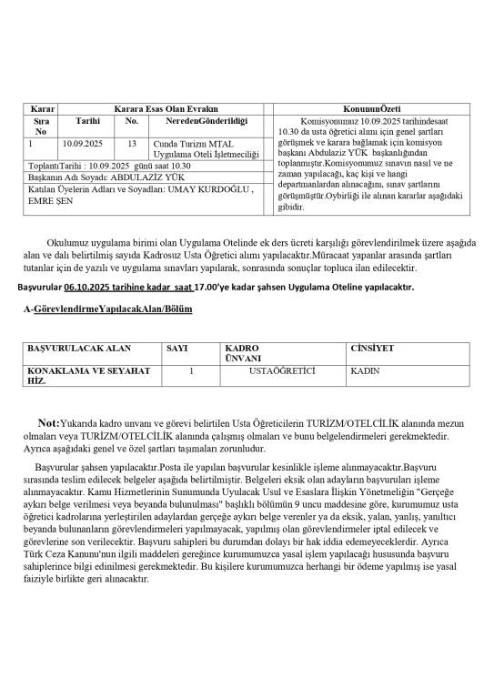 Başvurular 06.10.2025 tarihine kadar saat 17.00’ye kadar şahsen Uygulama Oteline yapılacaktır.